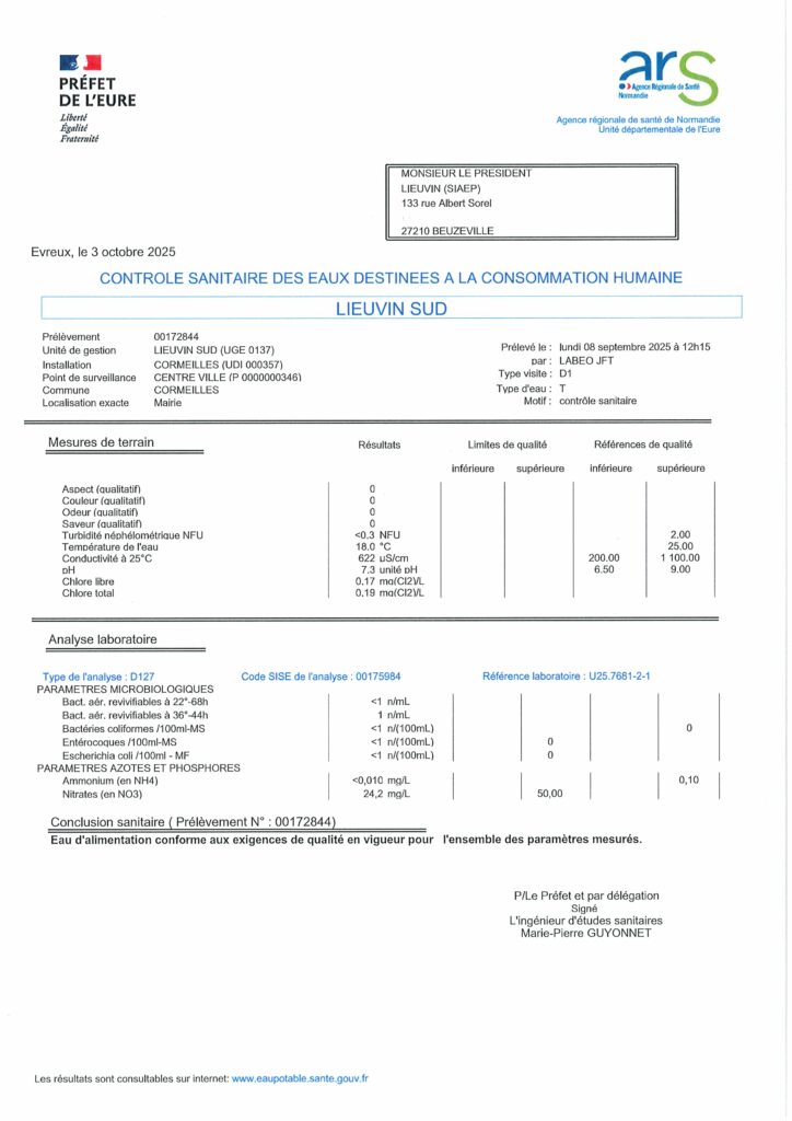 Le syndicat mixte fermé dénommé « Syndicat Intercommunal d’Adduction d’Eau Potable du Lieuvin » (SIAEP du Lieuvin) a été créé le 1er janvier 2020 est issu de la fusion du syndicat intercommunal d’adduction d’eau potable de Beuzeville et du syndicat d’adduction d’eau potable de Cormeilles-Lieuvin-Thiberville. Il est composé de 69 communes et de la communauté de communes de Pont-Audemer Val de Risle. Le Président est Monsieur Jacques ENOS. Monsieur Jean ROMAGNE (conseiller municipal) est 2ème vice-président.